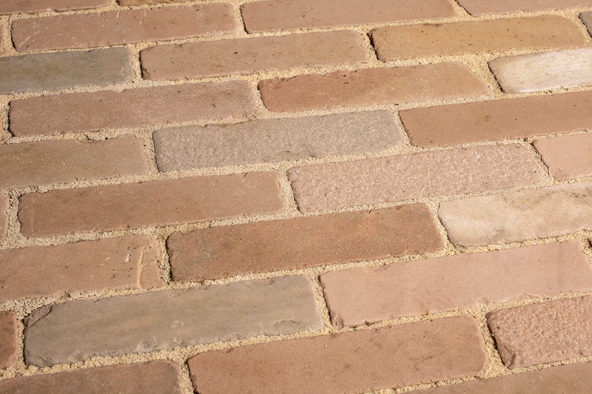 Beige sandstone pavers come in a tumbled finish, and are a great solution for driveways, pathways, and all outdoor spaces. The 200 x 50 x 40 size look great laid in herringbone or brick-bond, pointed or butted up. Should be sealed which will also bring out the colour.